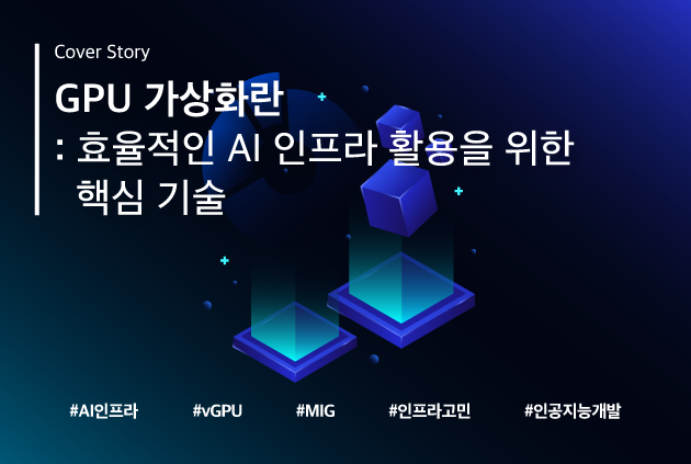 이번 Cover Story에서는 이러한 문제를 해결할 수 있는 방법으로 ‘GPU 가상화(Virtual GPU, vGPU)’ 기술에 대해 알아봅니다. GPU 가상화는 하나의 물리 GPU를 논리적으로 분할해 여러 사용자와 작업에 유연하게 할당할 수 있는 기술입니다. 이를 통해 자원의 활용도를 극대화하고, 운영 비용은 낮추며, AI 개발 환경의 민첩성과 확장성을 동시에 확보할 수 있죠.